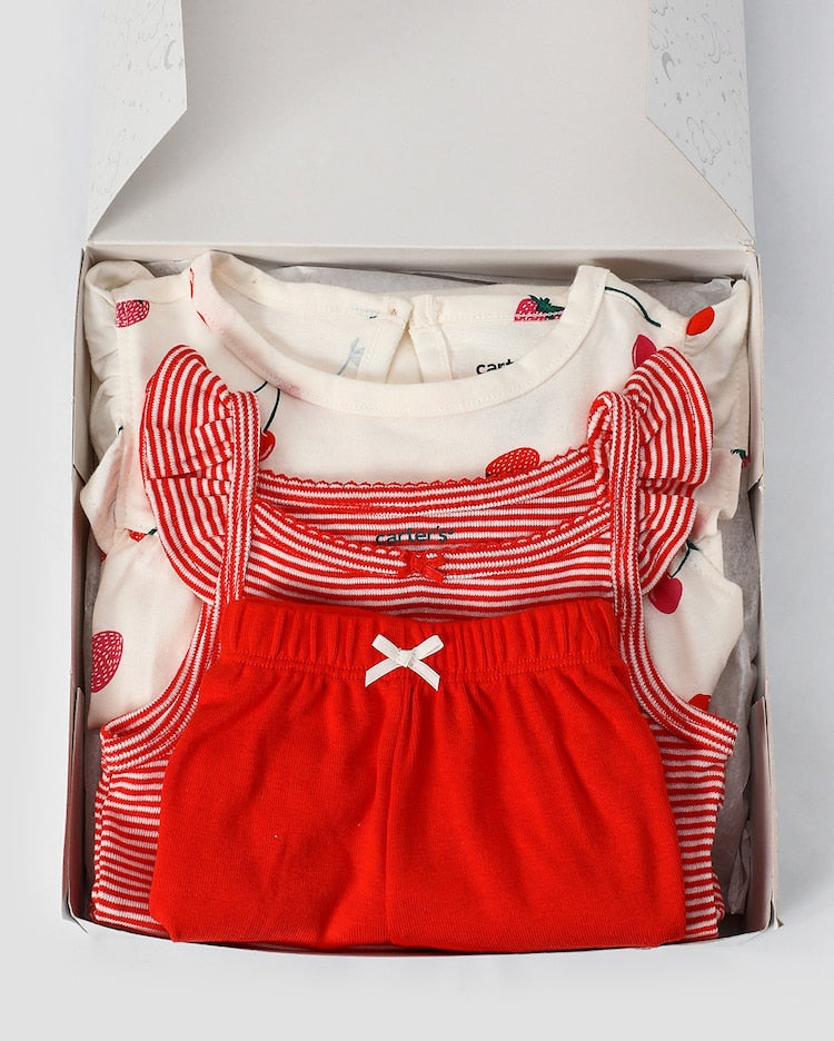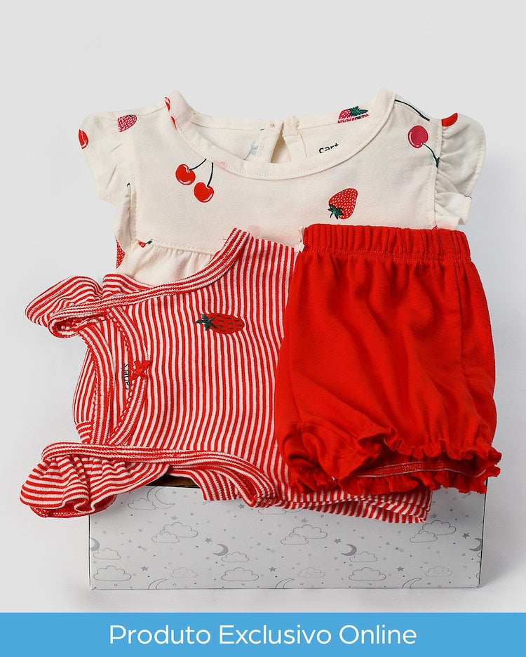 O Enxoval bebê 3 peças com babados morango listrado + caixa de presente P | Carter's é perfeito para deixar a sua princesa ainda mais lindinha. Feito de algodão, o conjunto vem com short com cós de elástico e dois bodies com abotoamento entrepernas, eles são super fofinhos e práticos com estampas de frutas, além de vir com uma linda caixa de presente. Aproveite!
