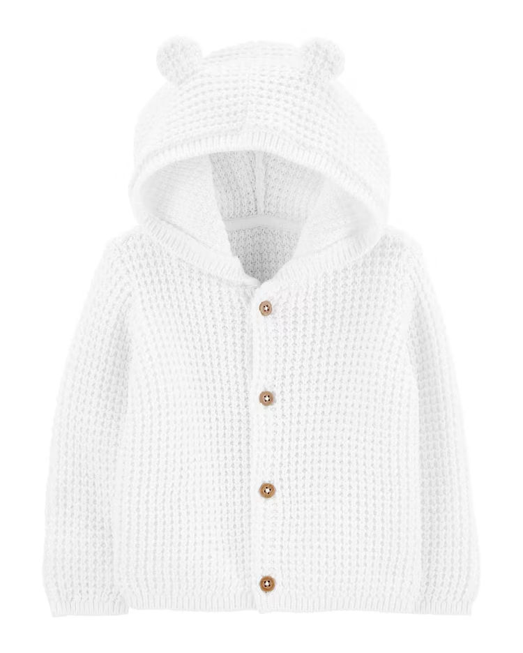 O Casaco Bebê Tricô Orelhinhas Branco Carter's Tam RN a 12 Meses é ideal para seu bebê, que ficará protegido do frio e super estiloso, o capuz com orelhinhas é o toque de fofura.
