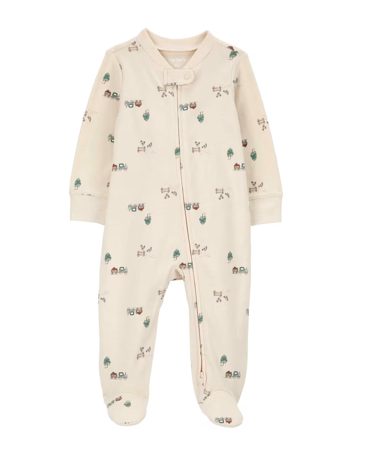 Deixe o seu baby ainda mais fofinho com o Macacão bebê com pezinho fazendinha bege | Carter's. Feito de algodão, o macacão possui zíper inverso, martingale para proteger os dedos de seu baby, gola em ribana canelada e manga longas. A estampa de fazendinha é um detalhe a parte que traz ainda mais charminho para a produção de seu pequeno. Aposte!