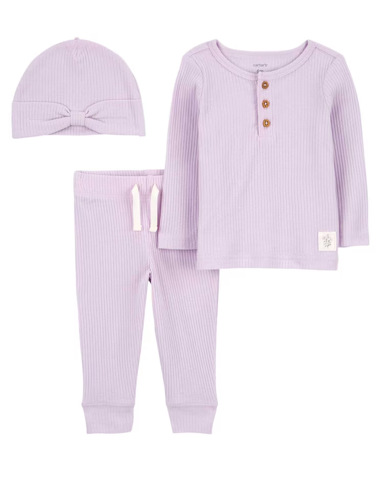 O Conjunto longo bebê 2 peças e touca canelado lilás | Carter's é ideal para os dias mais amenos e esbanjam charme e fofura. Composto por uma camiseta de manga longa, calça com cós elástico e acompanha touca. Perfeito para o cotidiano dos papais e mamães pois os itens combinam perfeitamente entre si e também podem compor outros diversos looks. Seu bebê ficará confortável e estiloso, invista!