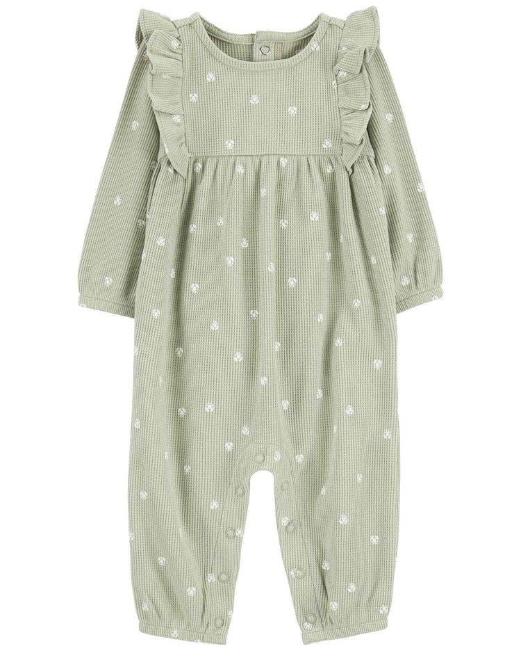 Nós sabemos como é importante ter peças práticas, funcionais e lindas para os primeiros meses de sua baby. Por isso, trazemos o Macacão bebê com babados texturizado floral verde | Carter's para que ela fique sempre segura e confortável. Confeccionado em material macio e aconchegante, a peça possui abotoamento entrepernas para facilitar na hora da troca de fralda, além de mangas longas, babados nos ombros, tecido texturizado e estampa floral. É ideal para aqueles dias mais frios, além do modelo esbanjar fofura e delicadeza. Invista!